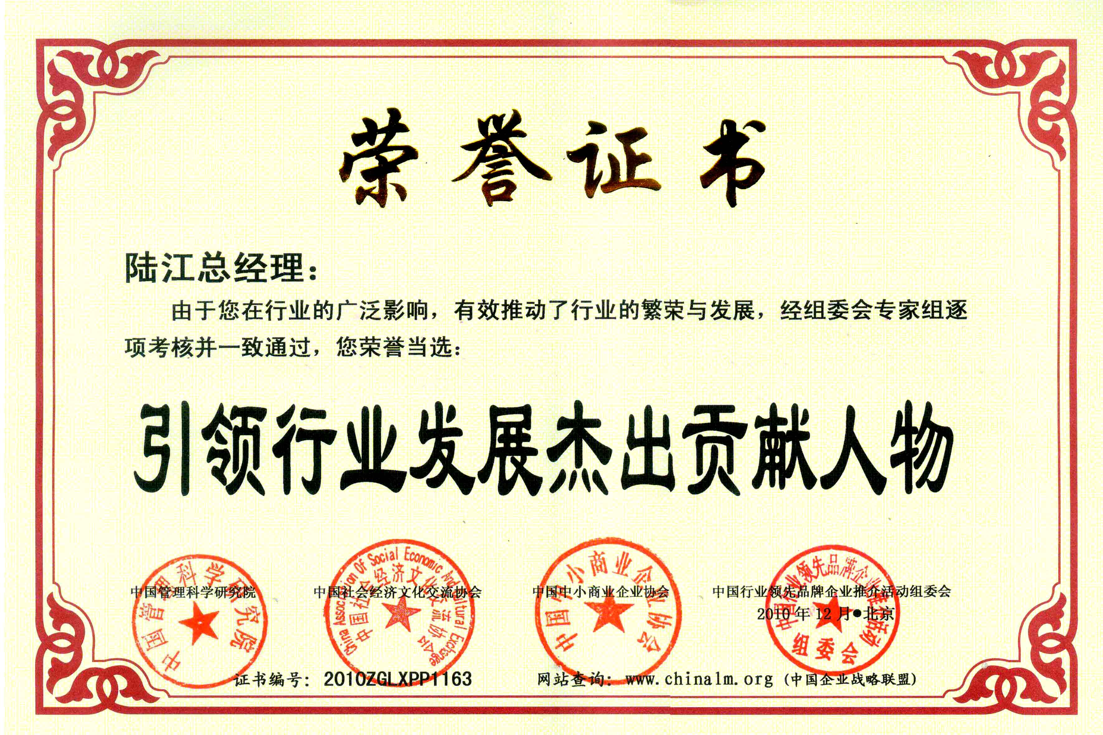 陸江榮獲引領行業發(fā)展杰出貢獻人物證書 --------卓康公司榮獲全國質量、服務、信譽AAA級品牌證書