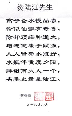 新疆63歲的賀兆生飲用一年,冠心病未愈,他用電話介紹是食堂管理員,問他食量多少?說吃七八分飽,睡前還吃兩袋牛奶,陸 江說我在論文和書中多次批判“吃七八分飽”,關照患者務必用“己饑方食”控制主食肉食量,要他把牛奶改在早中餐吃,減少主食肉食量,建議不吃晩餐,晚上只吃一個蘋果,再經幾個月補水節(jié)食,治愈了21年的冠心病和肥胖、失眠等病,信中由衷地感激陸 江為再生父母。[13]因為醫生從未過問他的膳食習慣,只管開處方藥或手術,父母也不會叫他不吃晩飯。